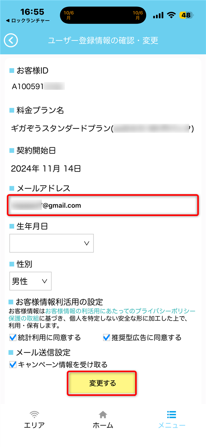 2.メールアドレスを登録または、変更し[変更する]をタップする。